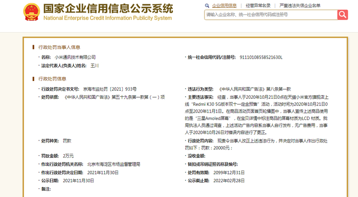 北京市海淀区市场监管局认为其违反了广告法,依据相关规定对小米通讯技术有限公司罚款2万元。