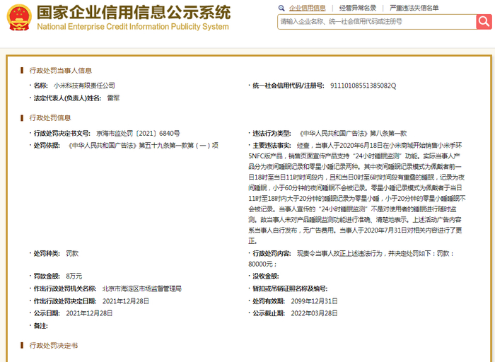 京海市监处罚〔2021〕6840号显示,经查,当事人于2020年6月18日在小米商城开始销售小米手环5NFC版产品,销售页面宣传产品支持“24小时睡眠监测”功能。实际当事人产品分为夜间睡眠记录和零星小睡记录两种。其中夜间睡眠记录模式为佩戴者前一日18时至当日11时时间段内,且和当日0时至6时时间段有重叠的睡眠,记录为夜间睡眠,小于60分钟的夜间睡眠不会被记录。零星小睡记录模式为佩戴者于当日11时至18时内大于20分钟的睡眠记录为零星小睡,小于20分钟的零星小睡睡眠不会被记录。当事人宣传的“24小时睡眠监测”不是对使用者的睡眠进行随时监测。故当事人未对产品睡眠监测功能进行准确、清楚地表示。上述活动广告内容系当事人自行发布,无广告费用。当事人于2020年7月31日对相关内容进行了更正。