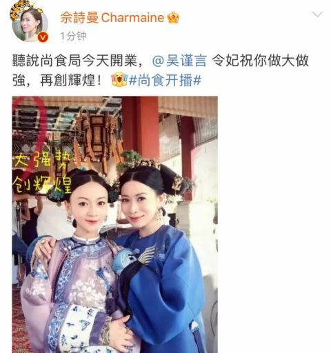 2月22日,由许凯、吴谨言主演的古装电视剧《尚食》开播。曾经一起在《延禧攻略》中出演的佘诗曼也为吴谨言打call:“听说尚食局今天开业,吴谨言令妃祝你做大做强,再创辉煌!”晒出了曾经两人一起在《延禧攻略》中的剧照,并配上“做大做强,再创辉煌”的字。