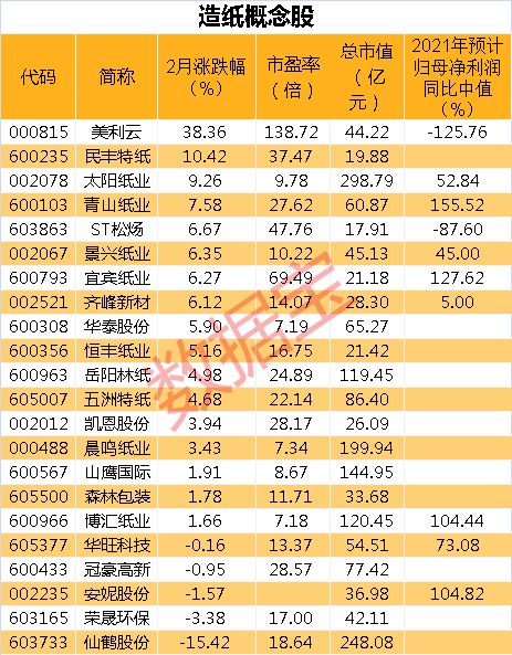 业绩上来看,10股发布2021年度业绩预告或业绩快报,其中8股预增。从净利润预计同比增幅中值来看,青山纸业、宜宾纸业、安妮股份、博汇纸业4股预计增幅超过100%,其他还有华旺科技、太阳纸业预计增幅在50%以上。