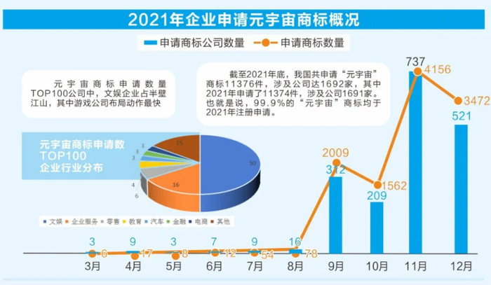 从企业热情看,记者从企查查获得的数据显示,截至2021年底,我国共申请“元宇宙”商标11376件,涉及公司达1692家,其中2021年申请了11374件,涉及公司1691家。也就是说,99.9%的“元宇宙”商标均于2021年注册申请。