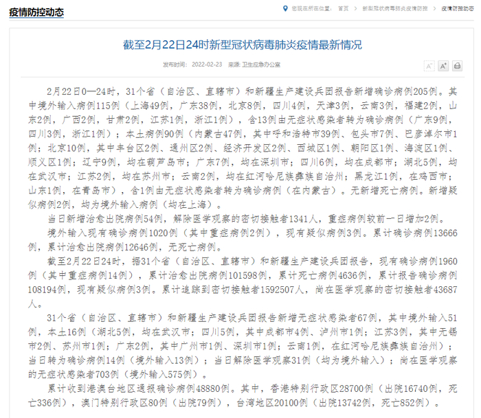 2月22日0—24时,31个省(自治区、直辖市)和新疆生产建设兵团报告新增确诊病例205例。其中境外输入病例115例(上海49例,广东38例,北京8例,四川4例,天津3例,云南3例,福建2例,山东2例,广西2例,甘肃2例,江苏1例,浙江1例),含13例由无症状感染者转为确诊病例(广东9例,四川3例,浙江1例);本土病例90例(内蒙古47例,其中呼和浩特市39例、包头市7例、巴彦淖尔市1例;北京10例,其中丰台区2例、通州区2例、经济开发区2例、西城区1例、朝阳区1例、海淀区1例、顺义区1例;辽宁9例,均在葫芦岛市;广东7例,均在深圳市;四川6例,均在成都市;湖北5例,均在武汉市;江苏2例,均在苏州市;云南2例,均在红河哈尼族彝族自治州;黑龙江1例,在鸡西市;山东1例,在青岛市),含1例由无症状感染者转为确诊病例(在内蒙古)。无新增死亡病例。新增疑似病例2例,均为境外输入病例(均在上海)。