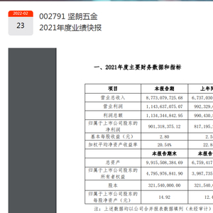 消息面上,2月23日晚间,坚朗五金发布业绩快报,2021年营业收入为87.73亿元,同比增长30.22%;归母净利润9.01亿元,同比增长10.29%;基本每股收益2.80元。报告期内公司持续下沉地级市和县城的销售渠道,同时新产品业务在报告期增长良好,进一步带动了业绩的增长。主要原材料价格面临大幅上涨,综合毛利率有所下降,对公司盈利水平构成了阶段性影响。