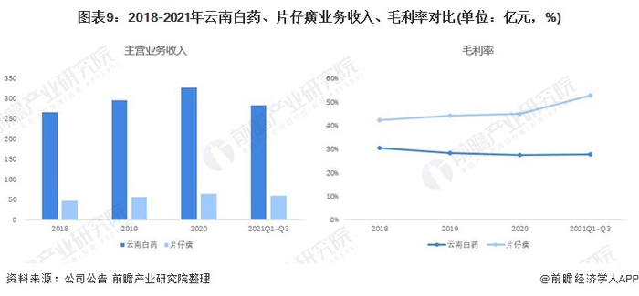 从经营情况来看,2018-2021年前三季度,云南白药的业务收入均领先于片仔癀,2021年前三季度,云南白药业务实现收入283.63亿元,片仔癀主营收入为61.12亿元。