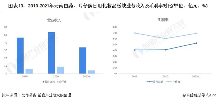 在日用及化妆品板块,云南白药营收规模同样远超于片仔癀,2021年上半年,云南白药日化用品达33.88亿元,片仔癀为4.32亿元。在盈利能力方面,片仔癀的日用、化妆品板块的毛利率则高于云南白药。