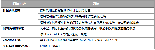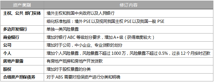 新规主要修订内容包括:信用风险标准法、信用风险内评法、CVA(信用估值调整框架)、操作风险标准法、杠杆率计算及G-SIBs(全球系统重要性银行)杠杆率缓冲计算、以及设置汇总计量上限。