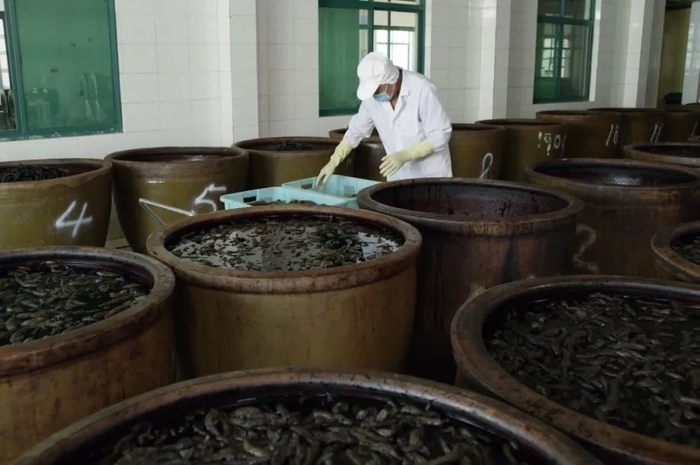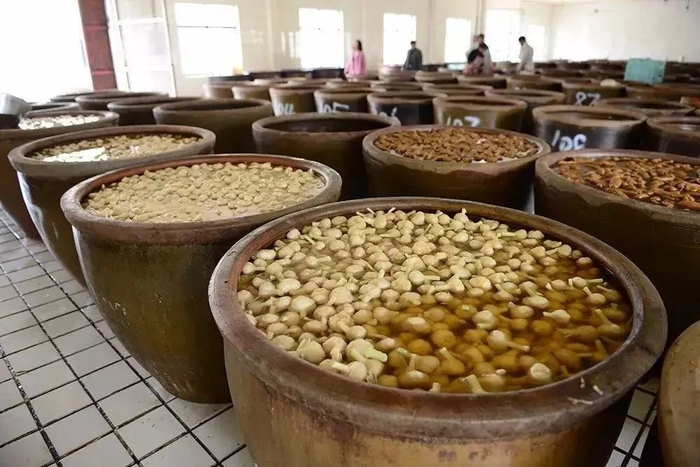 走进酱菜厂,工人们正在忙碌。一排排深褐色的酱缸里是调制好的酱汁,工人们手动搅拌。所有的酱菜都是从这些缸里出来的,特有的酱香在上空飘散。