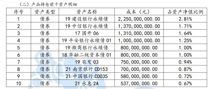 第一大持仓“19建设银行永续债”资产成本22.50亿元,占资产净值比例2.81%。