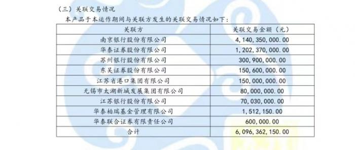 在关联交易方面,该产品在运作期内与关联方发生的关联交易共有九项,关联交易金额合计约60.96亿元。其中,与南京银行的关联交易金额最多,达到41.40亿元,占比约为67.92%。