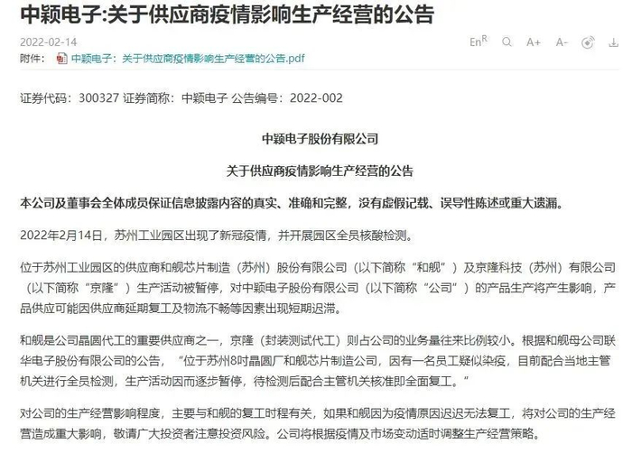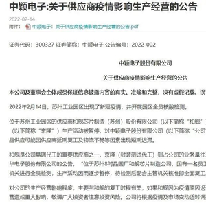 2月14日,中颖电子发布了《关于供应商疫情影响生产经营的公告》,提及由于和舰芯片制造(苏州)股份有限公司及京隆科技(苏州)有限公司生产活动被暂停,对公司的产品生产将产生影响,产品供应可能因供应商延期复工及物流不畅等因素出现短期迟滞。