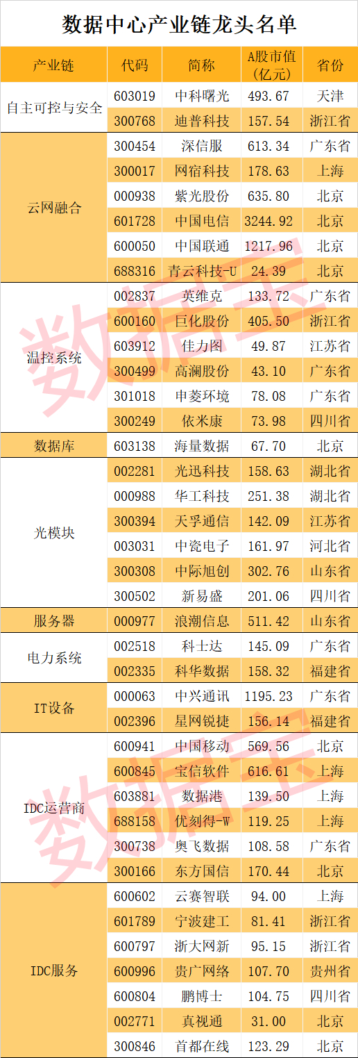 数据中心产业链细分龙头出炉