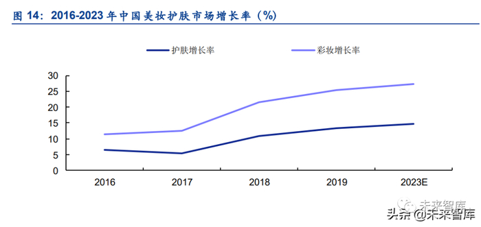 个人护理市场消费中护肤品消费占大半,彩妆市场潜力较大。女性消费者依旧是彩妆消费主 力军,其中 40% 以化妆视做为自我个性和情绪的表达。在“个性彩妆”产品中,唇釉、口 红发展较为成熟,而眼线品类消费增速最高约 35%。根据 Euromonitor 数据,2016 年到 2019 年,护肤品消费占个人护理消费比例从 50.6%增至 52.4%,增长率从 6.6%升至 13.3%并预 计在 2023 年达到 14.7%。彩妆消费占个人护理消费比例从 2016 年的 8.3%涨至 2019 年的 12%,增长率从 11.4%增长到 25.3%并预计在 2023 年实现 27.4%。目前国货护肤品牌绝大 多数分布在中高端、大众化梯度,部分品牌开始进军“抗衰”高端市场。