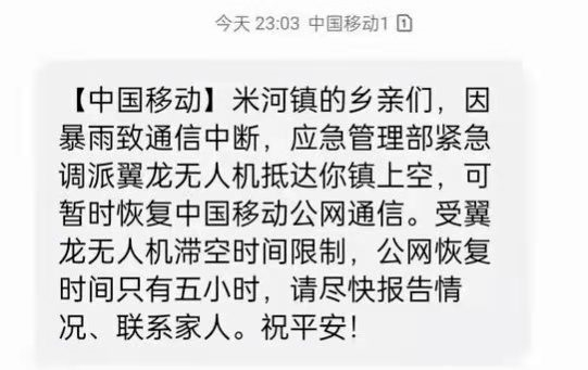 2021年7月21日,河南普降暴雨,部分地区的信号塔被暴雨冲毁,郑州巩义市米河镇通讯中断,整个镇子失联,随后,焦急的居民收到了这样一条短信。