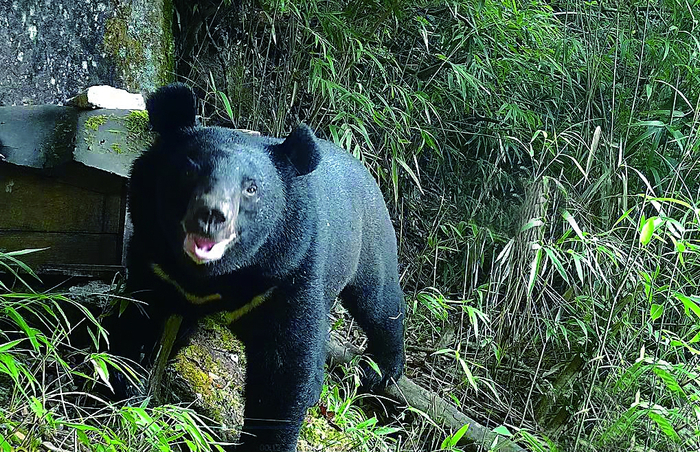 黑熊,别名狗熊、黑瞎子,苗族称“熊霸”。身体肥大,善爬树、游泳,能直立行走。食性较杂,以植物叶、芽、果实、种子为食,有时也吃昆虫、鸟卵和小型兽类。银竹老山丰富的动植物资源,为黑熊提供了丰实的食材,使其家族能够存活至今。