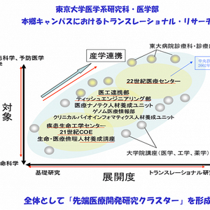 为搭建医学与工学之间的桥梁,东大医院成立了医工合作部,其核心是促进科研成果的临床应用转化,切实解决临床问题。此外,东大医院还分别与药学、信息学、化学等关键性学科紧密联系,共同成立了医疗纳米技术人才培养中心、基因组医学信息部、生物信息学人才培养中心等研究机构,并在东京大学中多次组织医学、工学、药学等多学科讲座。