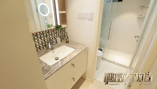 改造后设计师通过调整次卧门的位置,利用原有过道空间将卫生间进行三区分隔,使洗漱区、如厕区和淋浴区相互独立,并且每个区域都有相应储物空间。