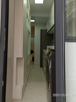 因卫生间空间狭小,洗衣机被挪到厨房区域,但过道宽度不足,洗衣机门无法正常开启,因此尚品宅配特别定制了特制厨房柜门,让问题迎刃而解。