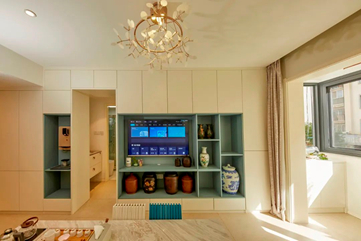 改造后,设计师合理设置沙发、茶几、电视柜的比例,拓宽了过道空间。精心挑选的沙发床,不仅增加了收纳空间,还能实现多人客居功能。专门定制的多功能茶几,既能泡茶又能储物。茶几下放置的变形组合椅,能极大地满足王兰兰的待客需求。