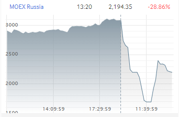 根据莫斯科交易所网站的数据,俄罗斯基准MOEX指数一度暴跌了45%以上,以美元计价的RTS指数一度暴跌超50%。