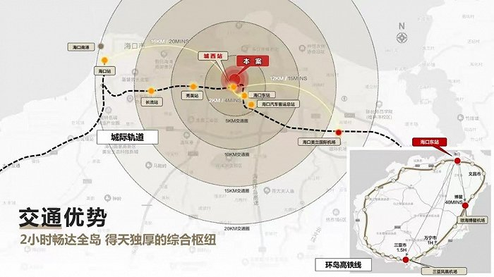 昆府天街的地段占据天时地利的交通节点,具有多重交通优势。在TOD模式下,毗邻城西站,接驳南海大道与龙昆南路两条城市主干道,串联美兰国际机场。同时设有7个公交站,规划22条公交线,对内连通龙华、美兰与秀英主要区域,便捷的公共交通可到达海口各个区域;对外以高铁成西站为基点,与环岛高铁无缝连接,形成两小时环岛经济圈,通达岛内其他城市,可辐射全岛居民,汇聚全球客流。