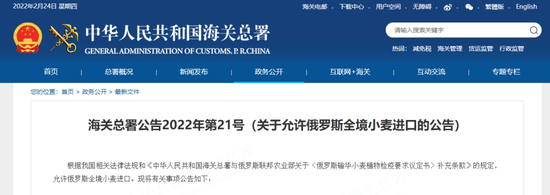 值得注意的是,就在2月24日,海关总署发布了一则公告称,允许俄罗斯全境小麦进口。公告称,俄罗斯小麦,是指在俄罗斯联邦境内且未发生小麦矮腥黑穗病的地区种植的,仅限于加工用途的春小麦。