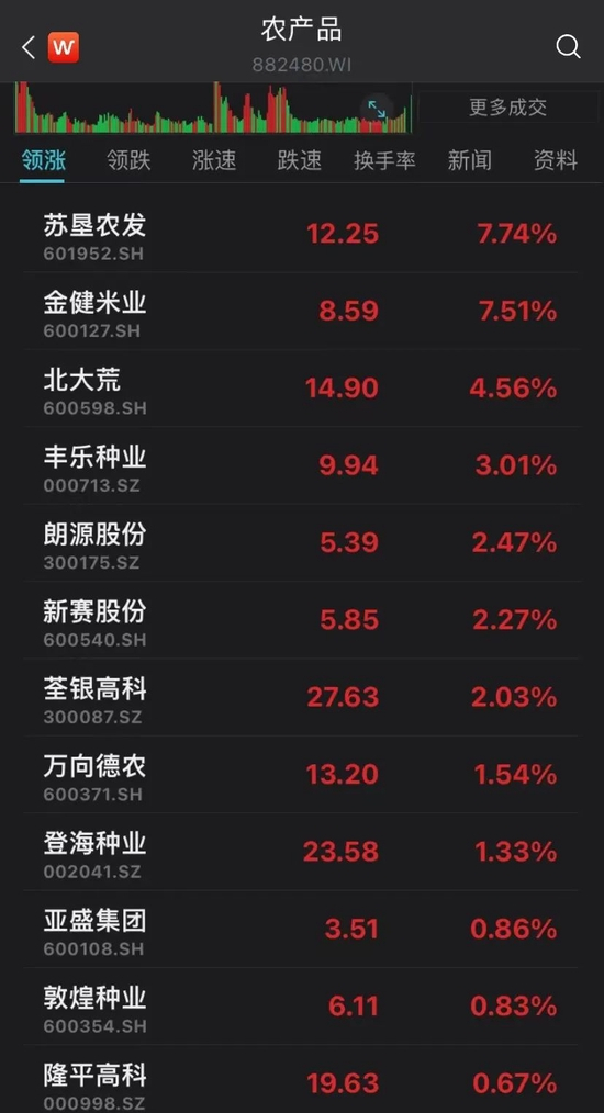 2月24日,A股农产品板块多只股票上涨。其中,苏垦农业、金健米业等涨幅超过7%,北大荒涨超4%。此外,化肥农业版块的中农联合亚钾国际涨幅超过6%。