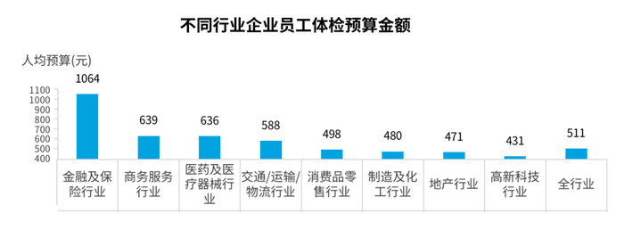金融和保险行业在体检预算方面遥遥领先,也是唯一破千的行业,人均达到1064元。与其他行业相比,该行业体检预算人均达到2000元以上的人数最多。