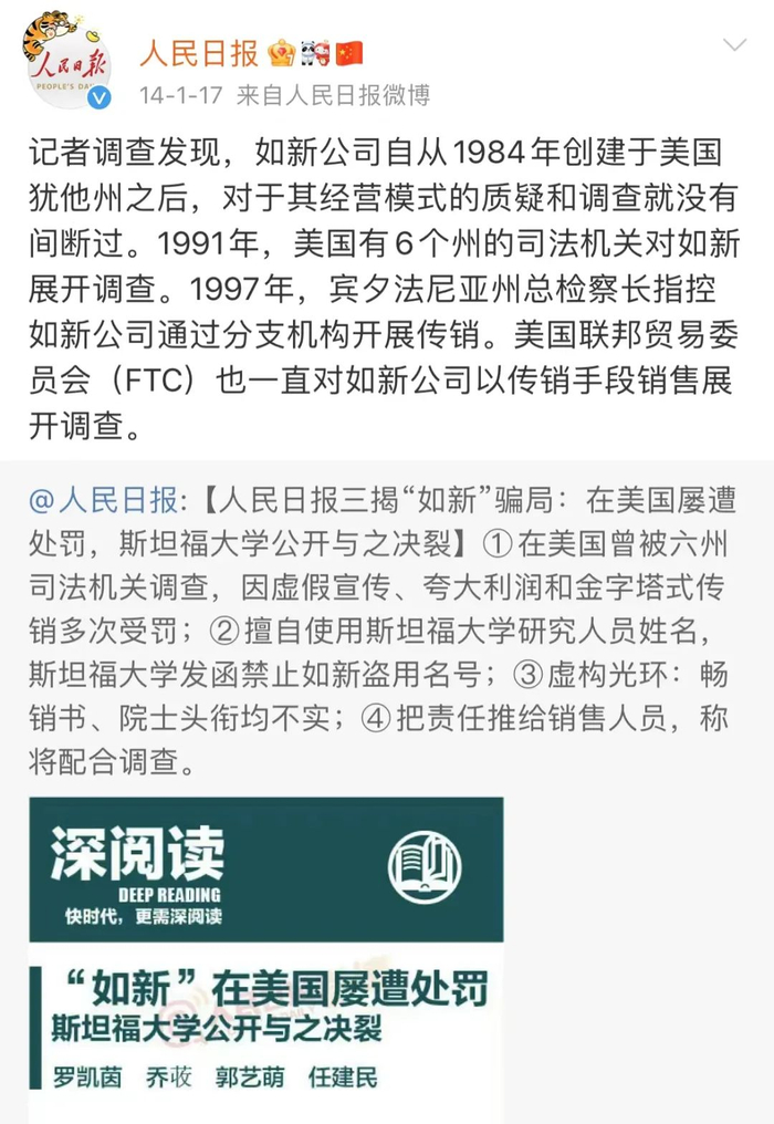 2014年,《人民日报》接连刊发《看“如新”怎样编织谎言》《看“如新”怎样攻陷人心》《“如新”公司在美国屡遭处罚斯坦福大学公开与之决裂》三篇报道。