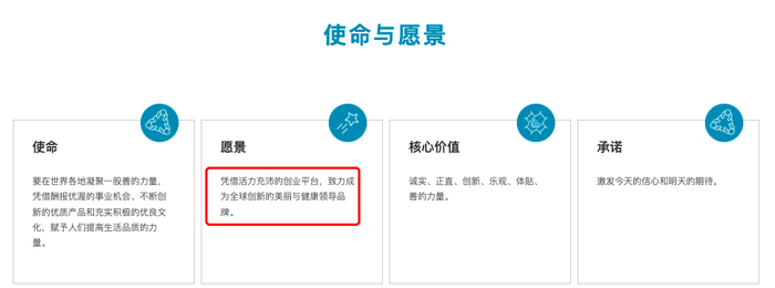 其公司愿景这样写道:凭借活力充沛的创业平台,致力成为全球创新的美丽与健康领导品牌。