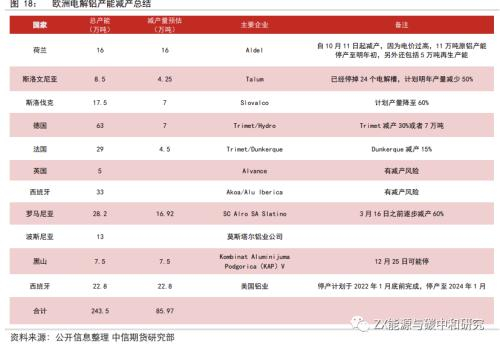 欧洲铝冶炼厂因电价上涨而准备减产的产能已经超过80万吨。根据IAI,欧洲电解铝总产能占全球总产能11%,除中国外占海外铝冶炼产能26%。根据CRU, 2021年Q4,欧洲有接近240万吨铝冶炼厂的电力来源是天然气。为了应对电价飙升,近期法国敦刻尔克铝厂减产将达到15%,此前其已经减产10%,叠加前期减产的产能,已有超过80万吨电解铝产能宣布将要减产,对电解铝供应冲击不容忽视。