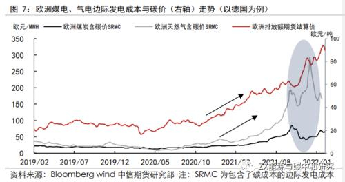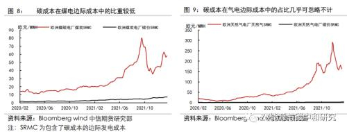 从图7中可以看出,实际上天然气发电的边际成本在2020年下半年以来持续地高于煤电,碳价格亦随之走高。随着2021年欧洲天然气价格暴涨,气电的边际成本与煤电的差距迅速拉大,煤电的经济性开始凸显,尤其是在2021年10月之后,气电边际成本继续拉升,而煤电边际成本下滑,二者之差急剧扩大,此时碳价格随之迅速上涨。我们认为该轮碳价上涨,与煤电经济性凸显,煤电发电量预期上升,碳配额需求增加有关。