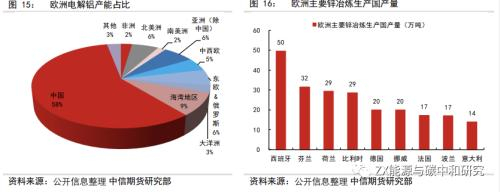 自去年三季度以来,受制于欧洲天然气价格与电价暴涨,大宗商品中耗电量较高的品种如铝和锌轮番发生减产。欧洲电力供需逐步趋紧,电价大幅上涨,有色金属冶炼厂成本大幅抬升,企业利润承压。欧洲众多大型冶炼公司宣布调减产量,引发市场剧烈反应。有色金属中,铝、锌受影响较大。从天然气测算的电价成本在有色价格的比重来看,铝价受电价影响最大,电价上涨对铝价推动更明显。而欧洲铝、锌金属的产量占比也较高,减产对有色市场冲击比较大。锌冶炼减产主要发生在西班牙、德国、荷兰、比利时、意大利等国,这些国家除了德国之外,天然气发电在电源结构中占比都很高,荷兰天然气发电占比59%,意大利占比48%,西班牙占比27%,发电成本比较高。