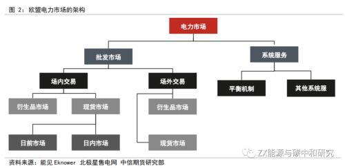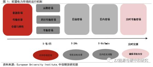 欧盟电力市场按照发生的时间节点,可分为远期市场、日前市场、日内市场和实时平衡市场。四个市场各司其职以实现最终电力市场供需的匹配,即市场出清。