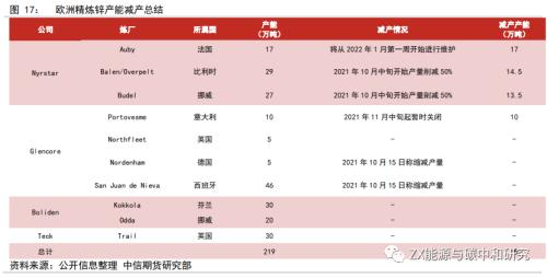 欧洲锌冶炼厂准备减产的产能也超过50万吨。全球最大锌冶炼企业之一Nyrstar称旗下Auby锌项目(年产能16.5万吨,10月份已经减产50%)将从2022年1月第一周开始进行维护,以应对法国当前和未来的电力价格大幅上涨。结合之前嘉能可位于意大利撒丁岛10万吨的硫化锌生产线停产检修,以及Nyrstar集团减产的45万吨,欧洲合计减产的锌产能已经超过55万吨。Nyrstar旗下三家冶炼厂产量合计约70万吨,若严格执行减产50%,即月均减产3万吨,减产规模约占全球月均产能的2.5%。