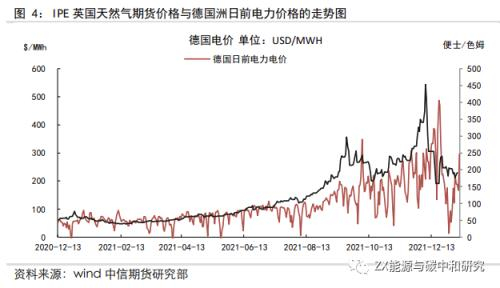 上述两个特征决定了欧洲电力价格对于天然气价格的高度敏感性。一方面,欧洲电力市场的市场化程度较高,而天然气发电是欧洲最主要的电力来源之一,因此天然气价格的波动很容易向电价传导。另一方面,欧洲 水电和可再生能源发电的占比高达41%,导致整个电力系统受天气影响较大,稳定性较为欠缺。 因此,燃烧化石燃料的发电机组灵活性好,具有调节和平衡用电峰谷的作用,从而导致电价对天然气价格高度敏感,尤其是在能源较为短缺时,电力短缺可抬升天然气价格,而天然气价格反过来也会助推电价。 从图4可以看出,IPE英国天然气期货价格与德国电价亦步亦趋,呈现出较高的相关性。