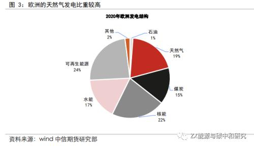 天然气发电占比较高。欧洲发电结构有两个明显的特征:一是,非化石能源电力占比较高,核电、水电和可再生能源发电合计占欧洲总发电量的63%;二是天然气发电占比较高;天然气占比高达19%,远高于煤炭(15%)和石油发电(1%)。