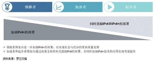 图3针对不同国家的政策建议虽然IPv6和“IPv6﹢”技术拥有众多优势,但是实际部署实施过程中依然面临众多挑战。IPv6领跑者国家应该采取进一步措施,推动“IPv6﹢”的采用;而加速者国家和起步者国家应该利用政策工具加速鼓励IPv6和“IPv6﹢”的部署。