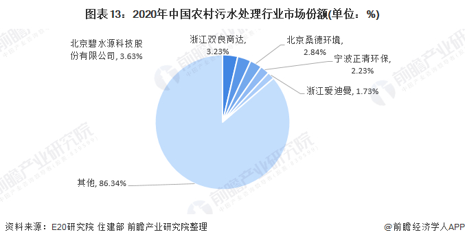 从农村污水处理市场份额上看,北京碧水源科技股份有限公司村镇污水处理项目总规模全国排名第一,市占率约为3.63%;其次是浙江双良商达环保有限公司、北京桑德环境工程有限公司、宁波正清环保工程有限公司和浙江爱迪曼环保科技股份有限公司,市占率分别为3.23%、2.84%、2.23%和1.73%。