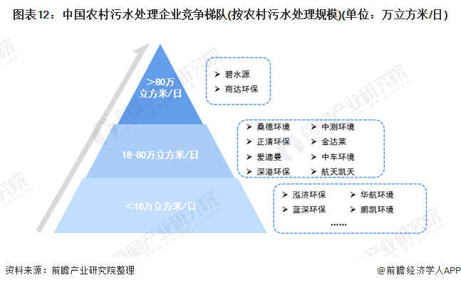 根据企业的农村污水处理总规模划分,可分为三个梯队,第一梯度为农村污水处理总规模在80万立方米/日以上的企业,有碧水源、商达环保。第二梯队为农村污水处理总规模在18-80万立方米/日以上的企业,包括桑德环境、正清环保、爱迪曼、金达莱、深港环保、中车环境、中测环境和航天凯天。第三梯队为农村污水处理总规模在小于18万立方米/日的企业,代表性企业有泓济环保、华航环境、蓝神环保、鹏凯环境等。
