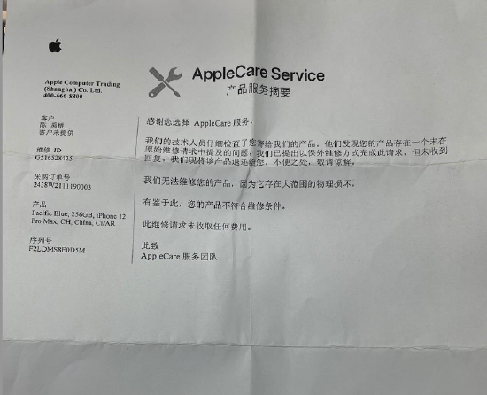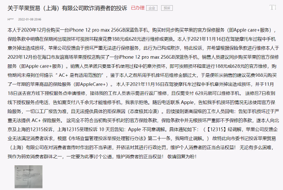 近日在人民网领导留言板上新增一则投诉留言,投诉中消费者称,自己在花费988元购买了苹果的一年期商品保险服务(AppleCare+)后,自己的iPhone 12 pro max 256GB手机意外损坏,却并没能成功保修,并需额外支付八千余元才能维修手机。