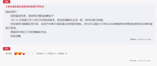 在领导留言板上,上海市浦东新区消费者权益保护委员会作出回复:该问题属合同纠纷,如双方协商不成应通过法律途径维权。也可以通过12348公共法律服务热线等途径就有关法律问题进行咨询。