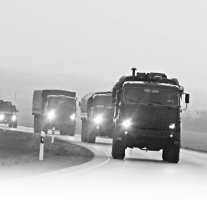 2月23日,俄罗斯军车车队正在向顿巴斯地区的边境移动。视觉中国供图