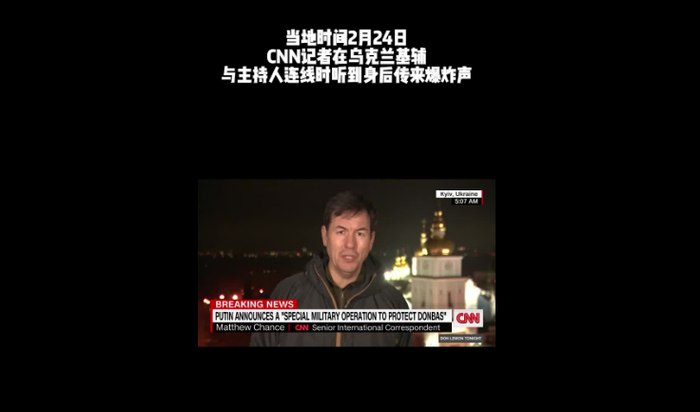 CNN记者在乌克兰基辅与主持人连线时听到传来爆炸声,这名记者称,“我刚刚听到了爆炸声,就在这里,在我身后 。”他表示,基辅发生了爆炸。↓