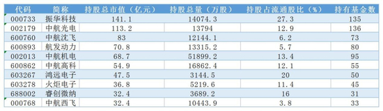 基金十大重仓股无论整体仓位大小,还是仓位比例都同步提升。所有基金持有的军工股市值为1037.2亿元,增0.45%至2.94%。积极型基金持有802.2亿元军工股票,仓位增加0.56%至2.83%。