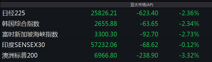 亚太股市表现疲软。日经225指数、韩国综合指数、富时新加坡海峡指数跌超2%,澳洲标普200指数跌超3%。