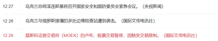 央视新闻消息,当地时间24日,乌克兰管理部门宣布关闭全国领空。稍早前,俄罗斯航空管理部门已通知各民航公司,已关闭与乌克兰接壤地区的领空。据国际文传电讯社消息,乌克兰与俄罗斯接壤的多处边境检查站遭到袭击。莫斯科证券交易所(MOEX)的卢布、股票交易暂停,因触发交易限制。