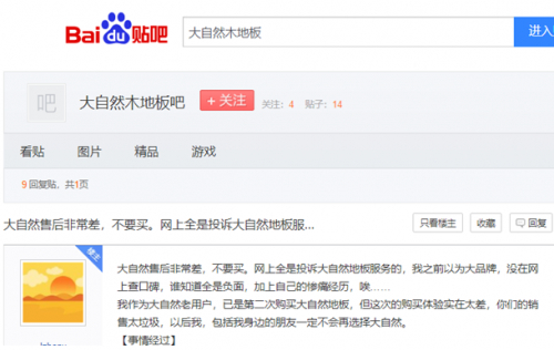 而在“大自然木地板”贴吧中,更有消费者网友直言“大自然售后非常差。”,并在帖子中详细描述了自己在大自然地板中不愉快的购物经历。
