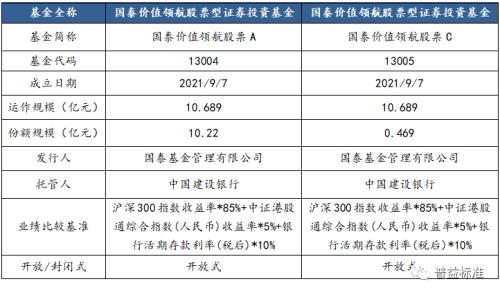 为排除投资环境等外部因素对对比结果的干扰,以及便于之后对产品运作情况的比较,我们选取与贝盈A股1期同期发行的股票型公募基金进行对比。根据普益标准收录的公募基金信息,成立日在2021年9月的公募股票型基金共计57只,占当月发行的242只公募基金的23.55%,其中,基金运作规模在10亿元以上的仅有1只。因贝盈A股1期募集规模超24亿,故选择运作规模最大的国泰价值领航股票型证券投资基金来进行对比,该只基金共分为两个份额,两只基金情况如下: