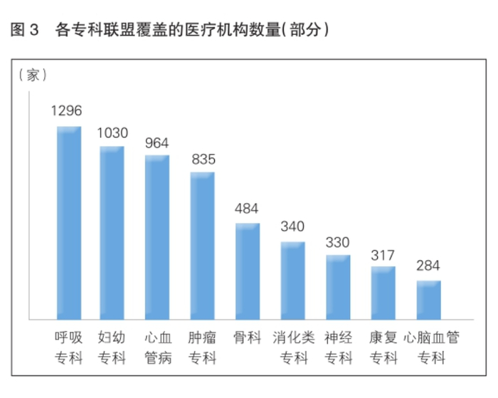 从排名靠前的几个主要专科联盟类型来看,呼吸和妇幼两大专科所覆盖的医疗机构最多,平均1个专科联盟可覆盖到近40家医疗机构,真正打破了区域、医院类型的限制。