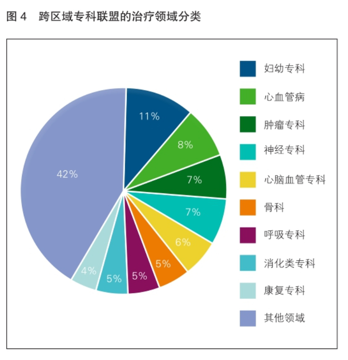 在跨区域专科联盟的医联体合作模式下,出现了针对不同治疗领域(专病)的联盟。在已知的联盟类型中,以心血管疾病、妇幼专科、肿瘤及神经类科室的专科联盟较为普遍。其他领域,如内分泌、影像医学、创伤科、皮肤科的联盟也正在发展(详见图3、图4)。